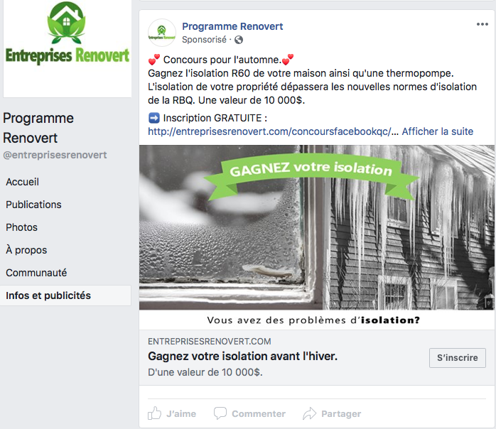 Ces annonces proposaient une inspection de votre entretoit gratuitement, ou encore des concours vous permettant de «gagner votre isolation avant l’hiver». Les fraudeurs ne se gênent pas, dans leurs publicités, pour faire référence au crédit d’impôt RÉNOVERT du gouvernement du Québec et certaines entreprises vont même jusqu’à s’en approprier le nom !