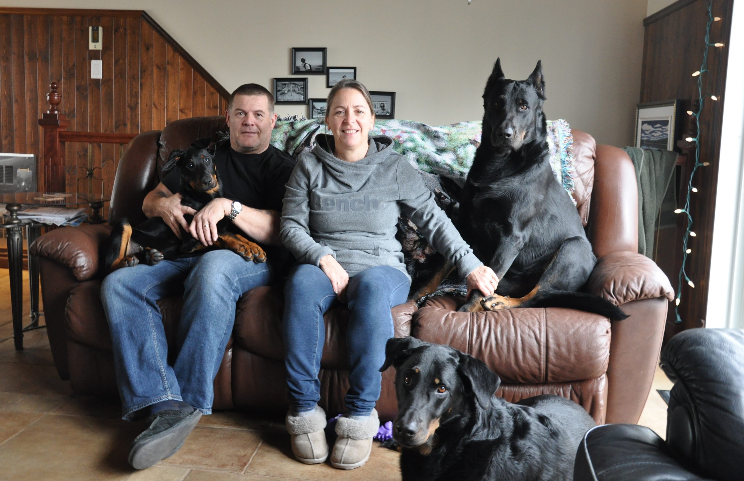 Après quelques recherches, il a trouvé un élevage de Bergers de Beauce, Les Monts Granit, dans le secteur de Thetford Mines. C’est ainsi que Fabien Roy et sa conjointe, Guylaine Bilodeau, ont adopté Tyson et Kayla, deux Beaucerons. Ce sont des chiens qui viennent de France, d’où leur nom.