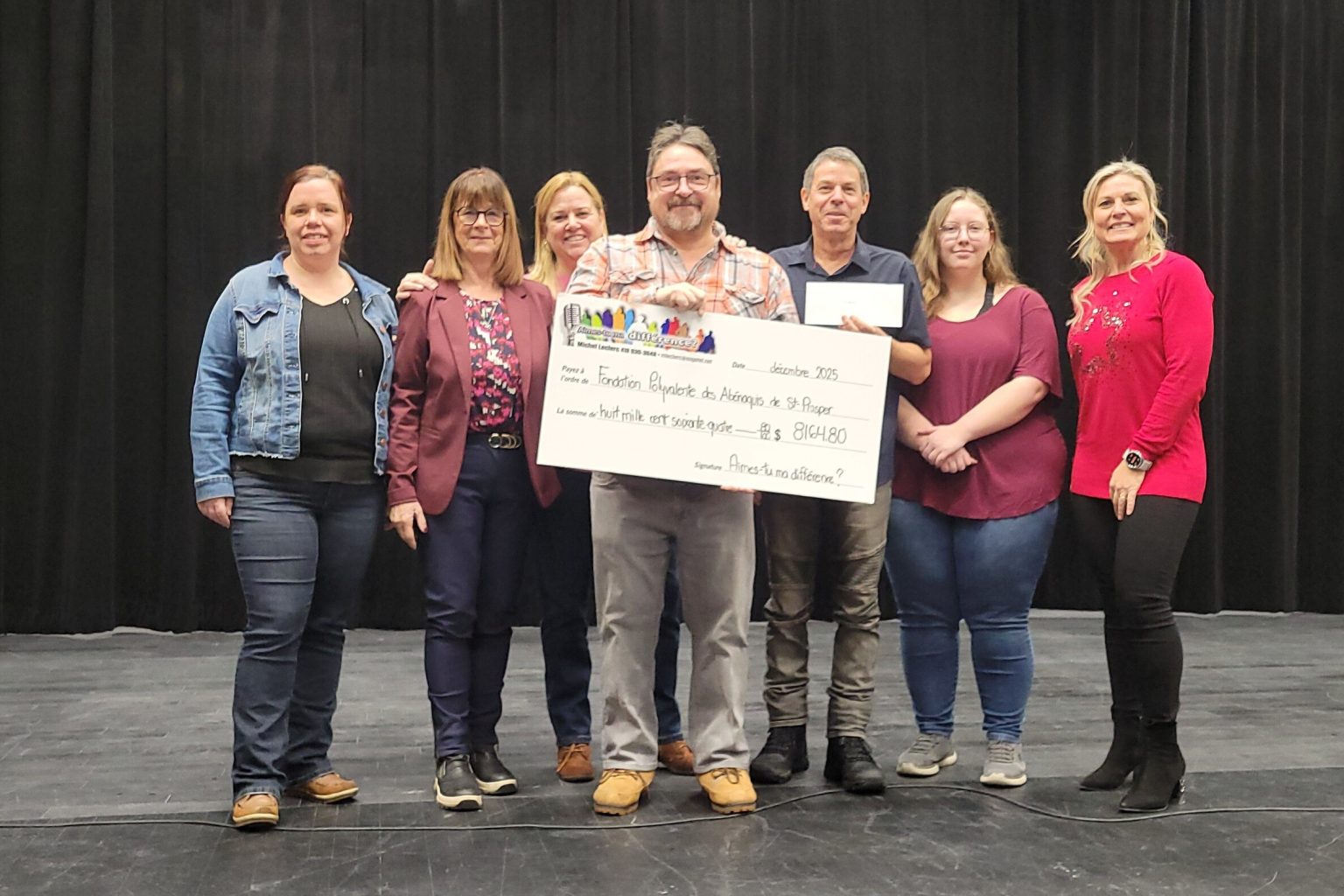 Dans les semaines suivant les deux représentations du spectacle Explosion, l'automne dernier à la polyvalente des Abénaquis de Saint-Prosper, l'organisme Aimes-tu ma différence remettait récemment 9 164,80 $ à deux organismes, soit 8 164,80 $ à la Fondation de la polyvalente des Abénaquis et 1 000 $ à la Maison des jeunes de Saint-Georges.