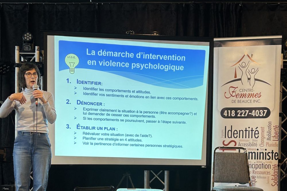« Reflétez avec bienveillance votre perception à la victime, en lui rappelant qu’elle n’est pas la seule à vivre cela et qu’il y a des organismes capables de l’aider. Parfois, il suffit de peu pour donner à une personne le courage de s’éloigner d’une situation inacceptable », a-t-elle mentionné durant sa conférence.