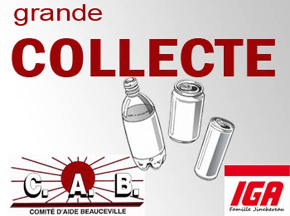 Le Comité d’Aide de Beauceville, en collaboration avec IGA Famille Jinchereau, tiendra une collecte de bouteilles et cannettes vides le samedi 23 mai prochain de 10h à 15h dans le stationnement de l’aréna de Beauceville.