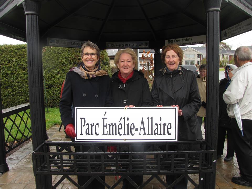 Le nom d’Émélie Allaire vise donc à reconnaître la contribution de cette personne au développement de Saint-Honoré dans les années 1880 à 1930. Petite-fille d’Émélie-Allaire, Hélène Jolicoeur était présente à l’inauguration avec ses sœurs Christine et Odette.