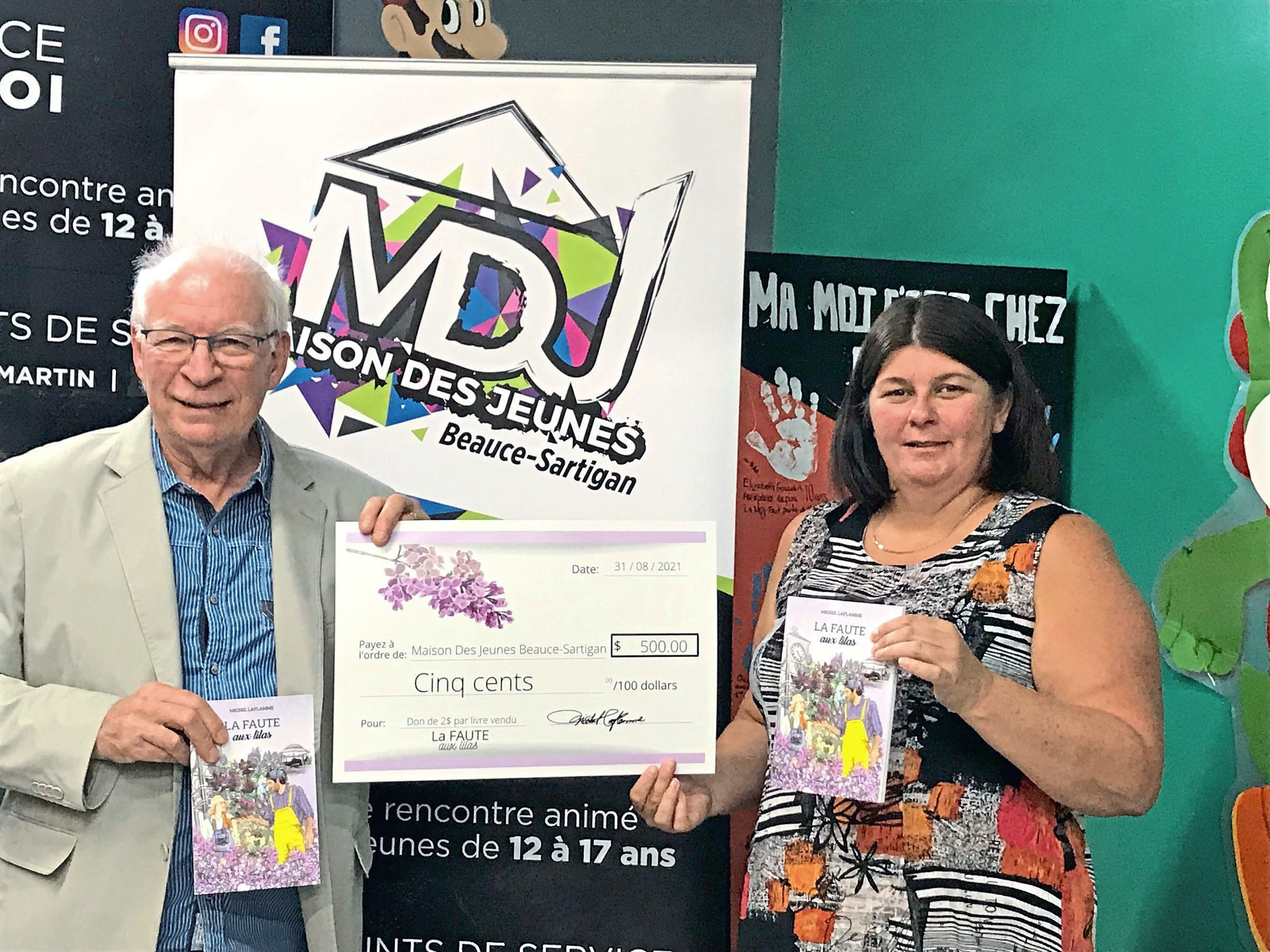ROMAN. Michel Laflamme, auteur du roman La faute aux lilas, a remis un premier chèque de 500 $ à la Maison des jeunes Beauce-Sartigan (MDJBS) le 31 août. Il avait promis, le 21 mai dernier lors de la sortie du livre, qu’un montant de 2 $ par ouvrage vendu allait être offert à l’organisme.