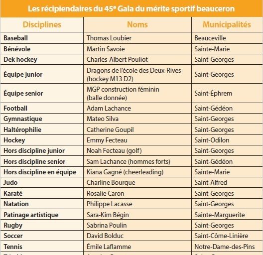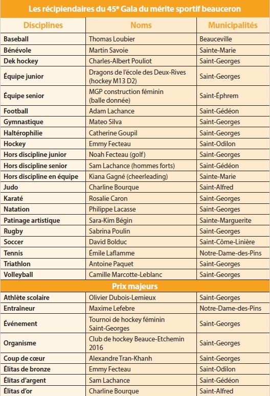 Le titre de l’entraîneur de l’année a quant à lui été décerné à Maxime Lefebvre de Notre-Dame-des-Pins. Celui-ci occupe le poste d’entraîneur-chef des Nomades de la Beauce, un club de football évoluant dans la LFQ9. Le Tournoi de hockey féminin de Saint-Georges a été nommé Événement de l’année, tandis que le Club de hockey Beauce-Etchemin 2016, qui est à la tête du Cool FM de Saint-Georges a remporté le titre d’Organisme de l’année.
