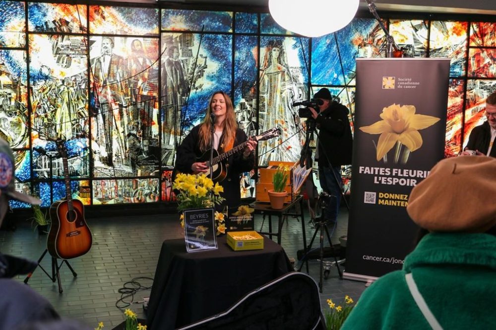 Pour l’occasion, la chanteuse-compositrice-interprète Amélie Beyries a offert une prestation surprise mercredi après-midi à la mezzanine de la station de métro Place-des-Arts, à Montréal.