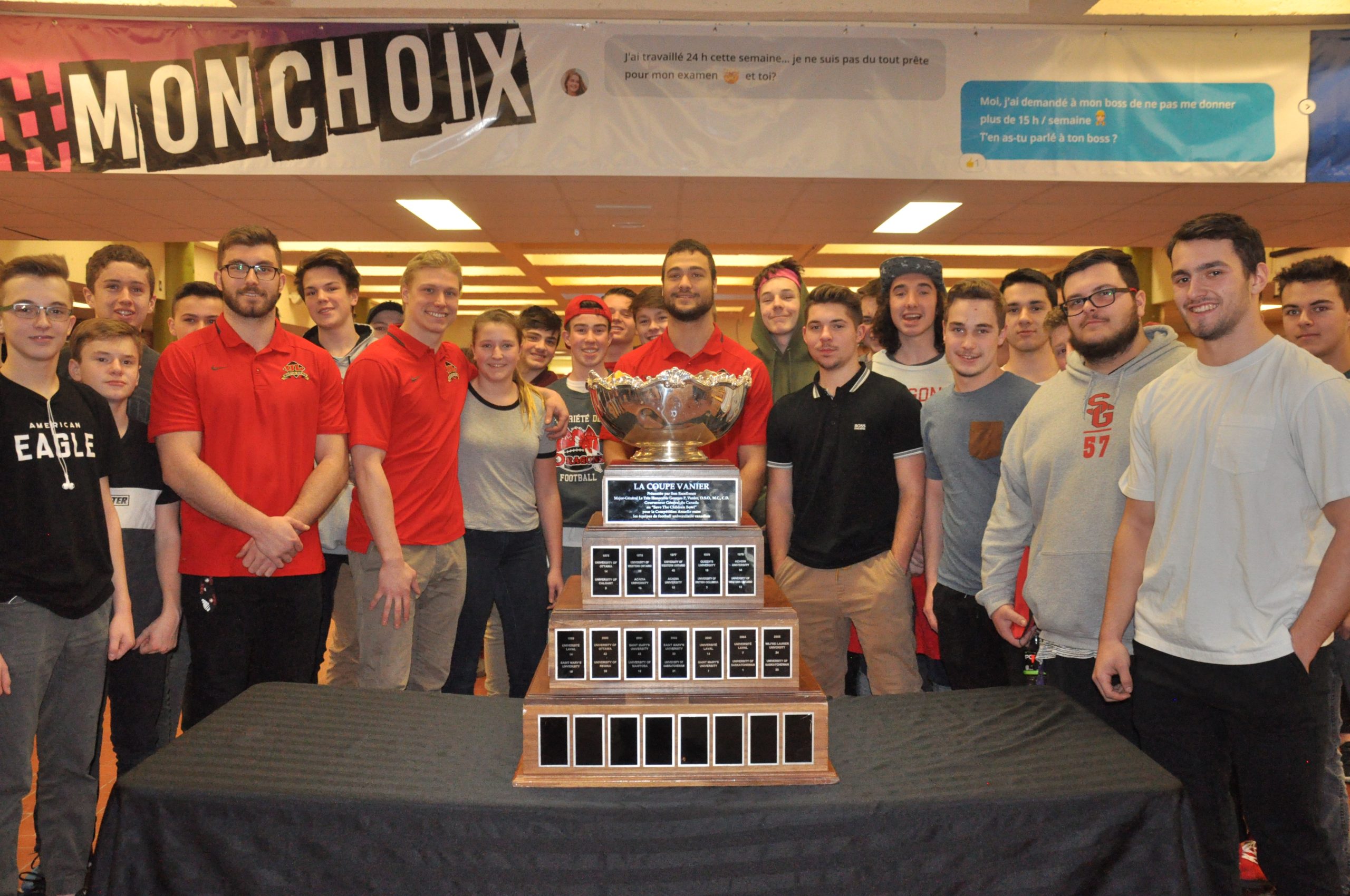 Ceux-ci ont accepté l’invitation de l’entraîneur-chef des Dragons, Carl Dallaire. «La coupe Vanier est un trophée prestigieux, c’est le plus gros trophée que tu peux remporter au football scolaire canadien. Que trois anciens Dragons viennent ici avec la coupe, ça peut motiver les jeunes à faire la même chose», explique-t-il.